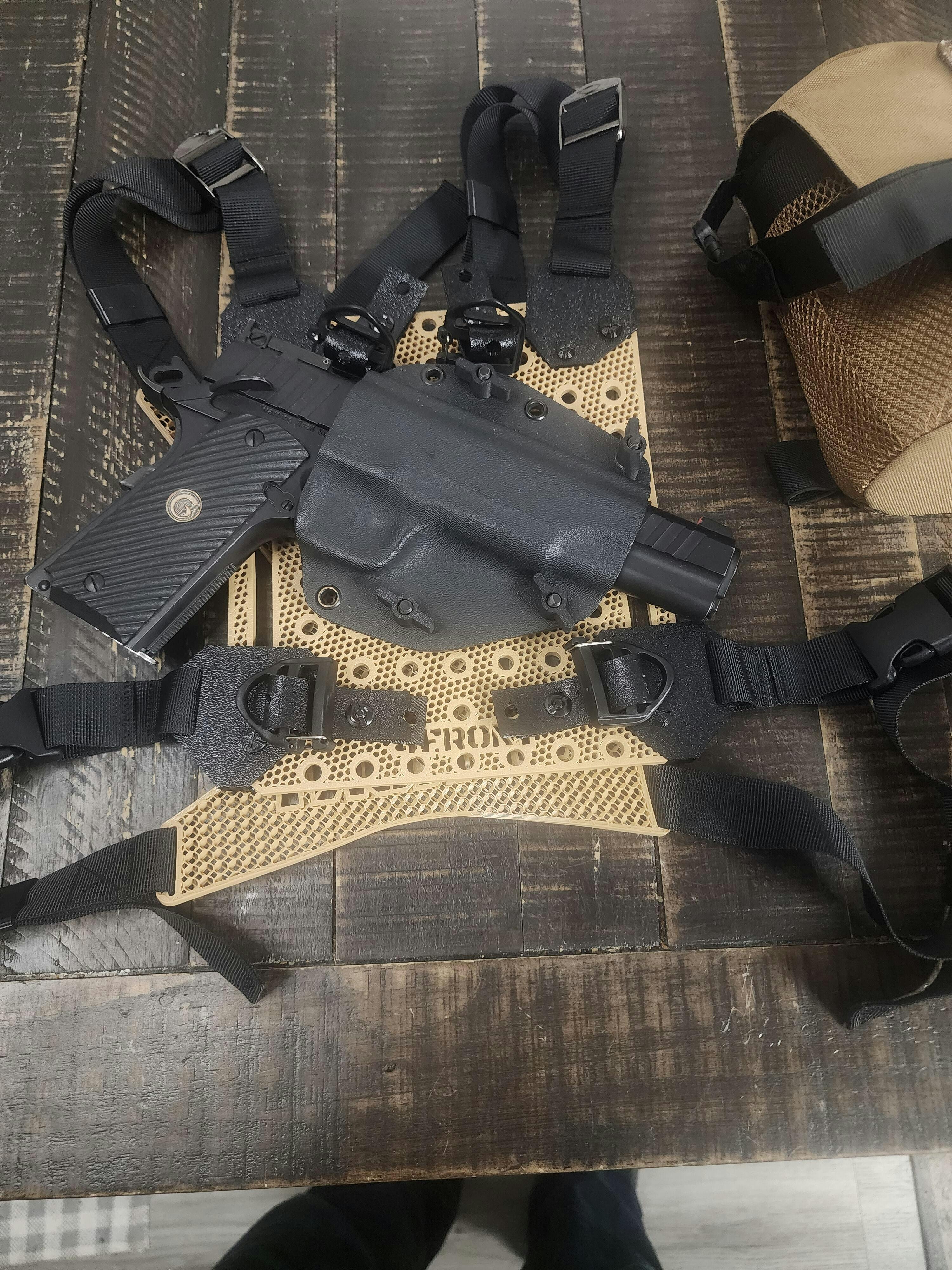 Welp, It sure took some time to get my FHF Pro-M Pouch, Harness and Pistola to work so that the pack wouldn't flop around or have the side straps covering the pistol handle. Pro-M is a small bino pack the 4Front is actually slightly bigger than the pack.