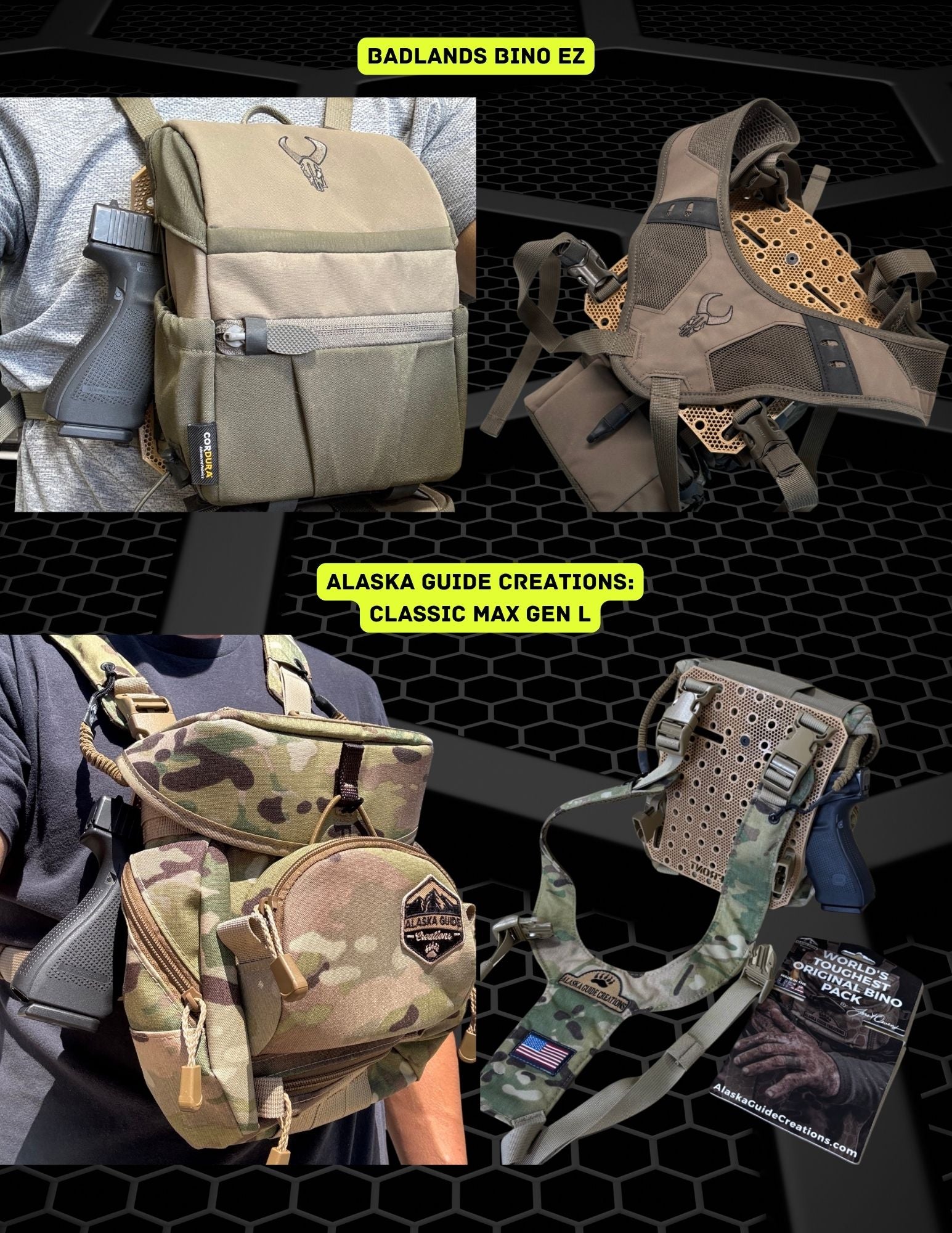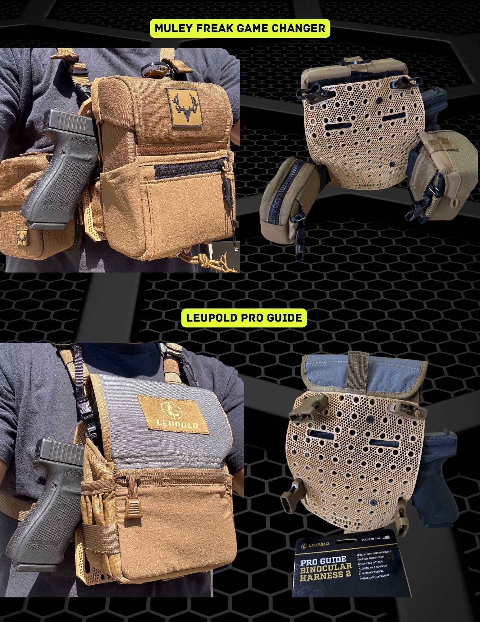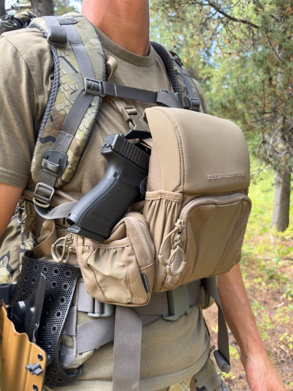 • Doesn't put the pistol low on your stomach like other bino / holster products which can get in the way when bending over or hill climbing.